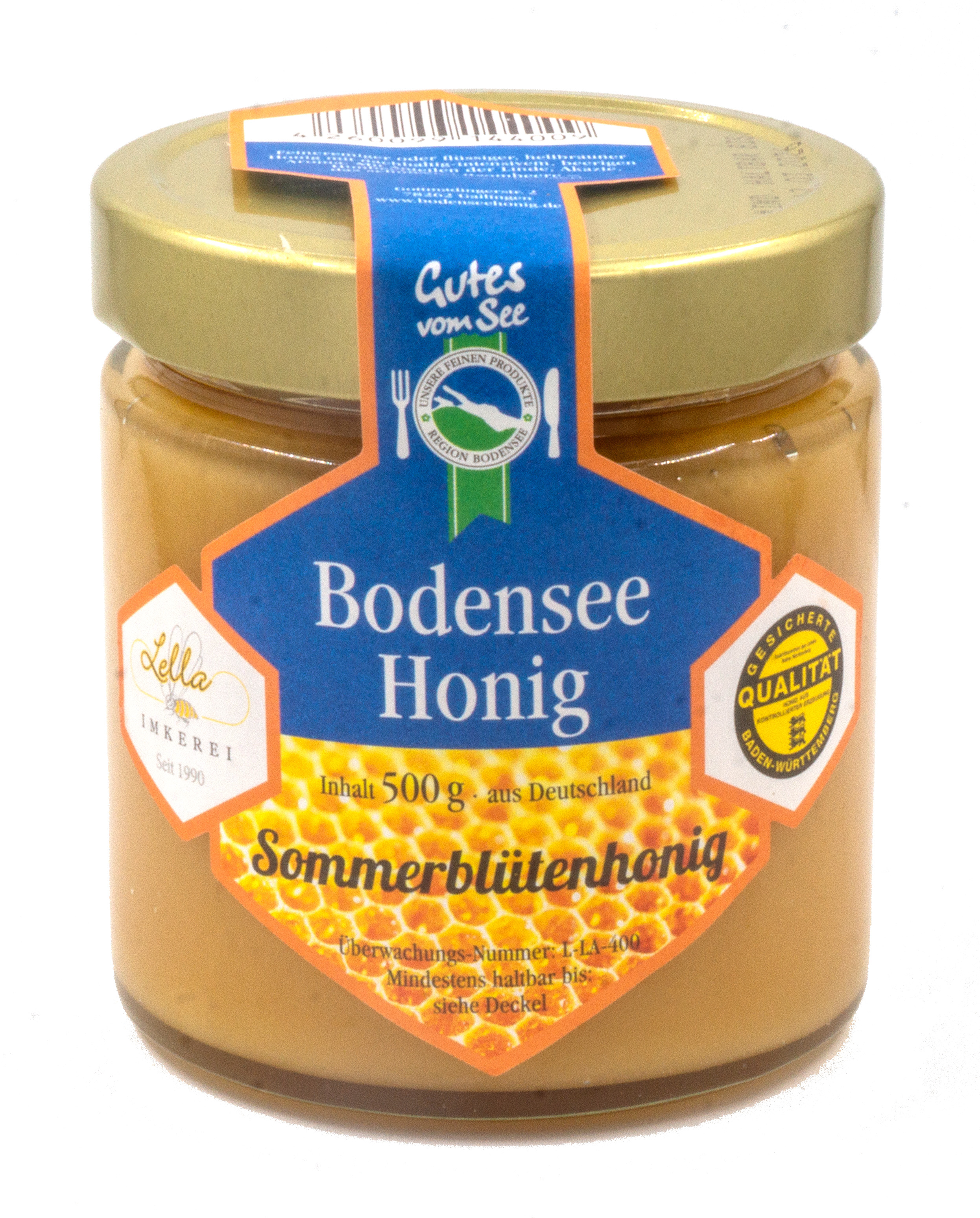 Bodensee-Sommerblütenhonig: Flüssiger hellgelber Honig. Nachhaltig intensives beeriges und angenehmes Aroma. Mit Anteilen der Linde, Akazie, Himbeere und Brombeere sowie Sommerblüher. Die Augen schließen und an den tollen Sommer denken. Kandiert nach 3–4 Monaten aus. Standort der Bienen: Gailingen, Binningen, Duchtlingen, Litzelstetten